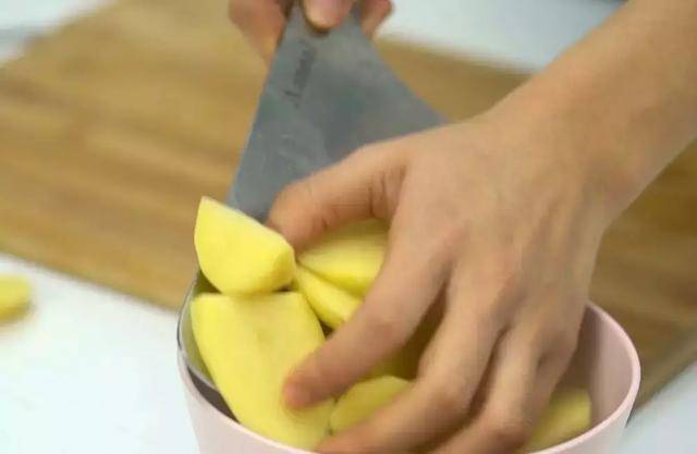土豆去皮之後,切成小塊,盡量切的薄一點,這樣會盡快蒸熟