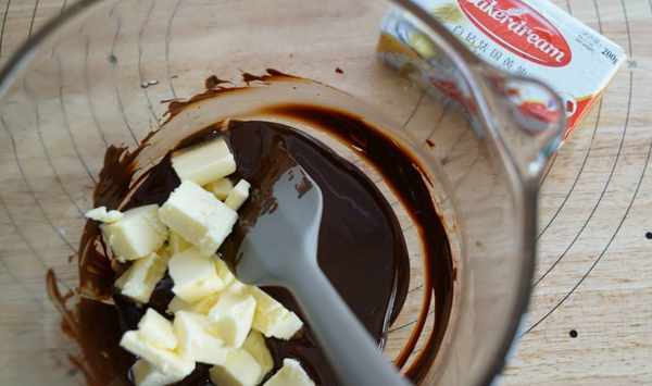 3、黃油切小塊加入到巧克力中,攪拌至均勻;