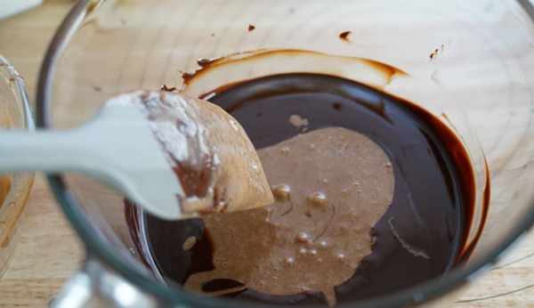 6、隨後把攪拌好的面糊倒入黑巧克力中混合均勻;