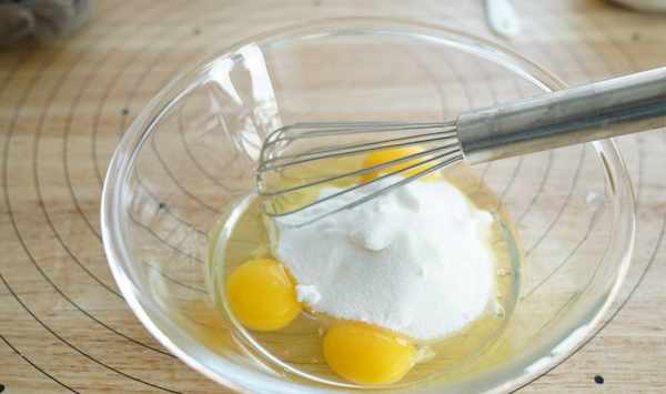 5、在蛋液中加入低筋粉和可可粉,在加入之前將兩者一起過篩,並將蛋液與粉攪拌均勻,不能在看到粉粒兒;