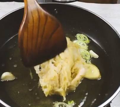 4.鍋中倒油,加入蔥薑蒜,擠過水的酸菜,炒幹。