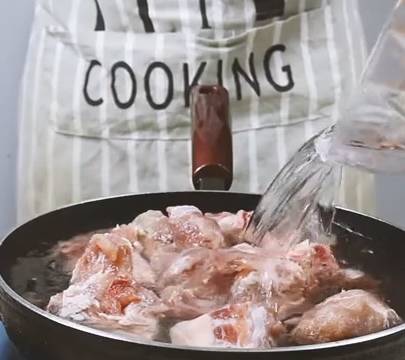 3.排骨再次入鍋,加入蔥薑,花椒,八角,桂皮,香葉,幹辣椒,料酒,熱水,小火燉30分鐘。