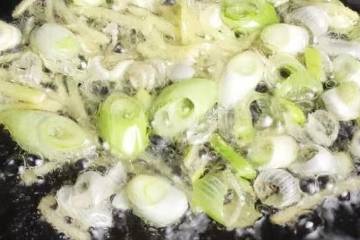 5.起鍋燒油,油溫五成熱時放入切好的蔥花和薑末翻炒,炒出香味。不需要炒太久,不然的話蔥花就炒糊瞭。
