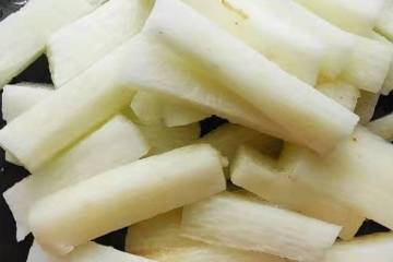 1.把山藥去皮洗凈,切成長2cm-4cm的長條備用。