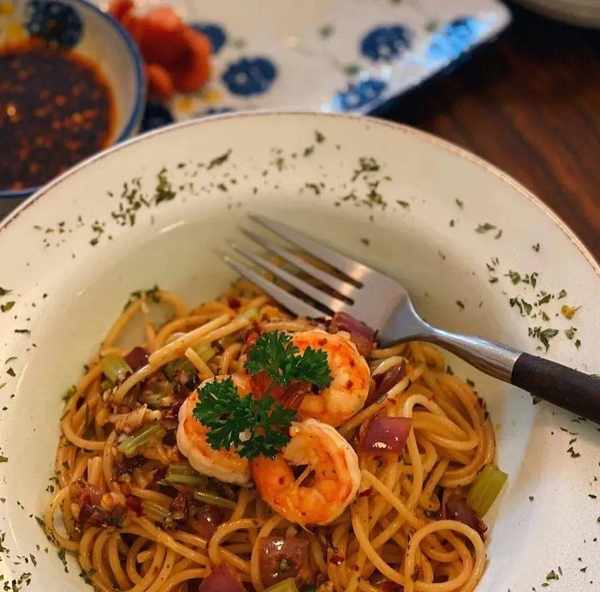 配上濃鬱的香蒜和歐芹,看似辛辣的搭配,細品之餘滿口盈香,意面和湖湘口味結合在這道菜上發揮得淋漓盡致。