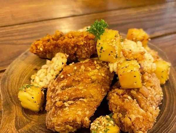 咸蛋黃雞翅宇宙真理:咸蛋黃可以焗一切!細膩的蛋黃入口是松沙的口感,咸和香在味蕾上完美交融,一盤雞翅包括辣味和原味,沒有濃重的油膩感,外酥裡嫩。店傢為瞭解膩還貼心的搭配瞭酸甜的菠蘿肉,贊!
