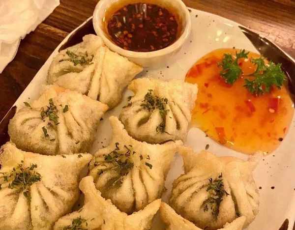 自制炸餃造型胖嘟嘟的很可愛。炸到酥脆的餃子皮,餡料飽滿。還提供兩種醬料,一甜一辣,單吃餃子一般,和普通煎餃沒什麼太大區別,主要是蘸料調的可以,拯救瞭這道菜。