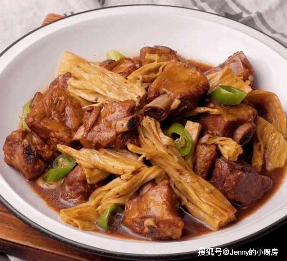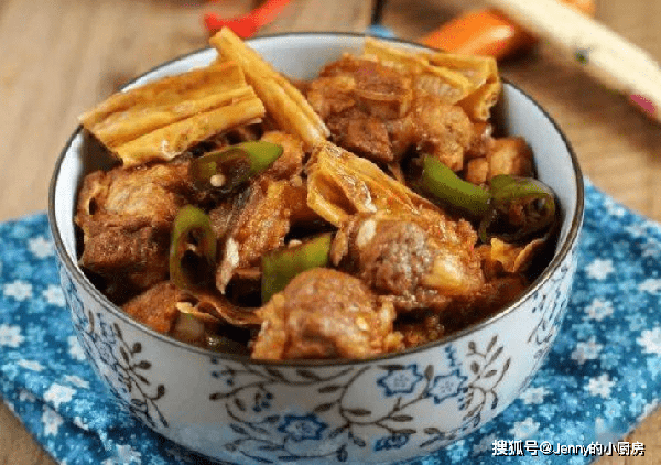 燉好後,去掉蔥薑、八角、香葉、桂皮,再放入泡好的腐竹、鹽,開大火收汁。