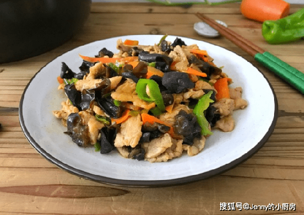 熱鍋涼油倒入肉片滑炒,炒到變色後盛出。然後倒入薑蒜爆香,再倒入胡蘿卜、黑木耳翻炒。
