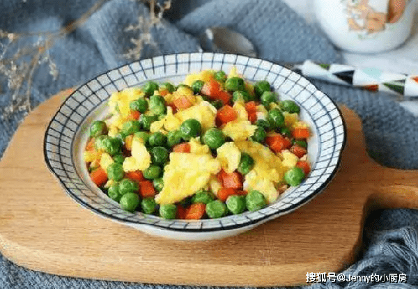 然後不加油,倒入胡蘿卜、豌豆翻炒,炒到豌豆斷生,再倒入雞蛋翻炒均勻。