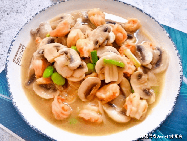 鍋內加油,燒熱後倒入蝦仁翻炒,炒到變色盛出。然後倒入口蘑、毛豆翻炒,炒到斷生。