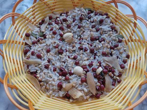 第一步:把紅小豆,糙米,大米,蕎麥仁,南瓜籽仁,百合,蓮子,都抓一些,搭配好,搭配的多少隨意就好。秋天天氣乾燥,多吃一些蓮子喝百合不但去火滋潤還潤肺,對於身體十分有益,唯一的一點就是比普通食材略貴。而紅豆有補鐵補血的特點,糙米的營養比普通的大米高很多,所以這樣的搭配很適合秋天。