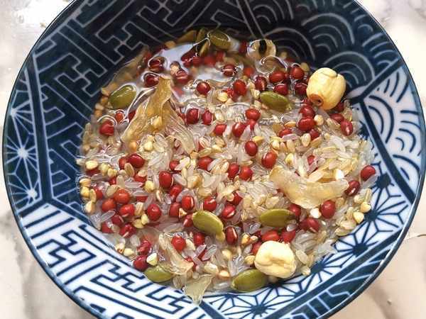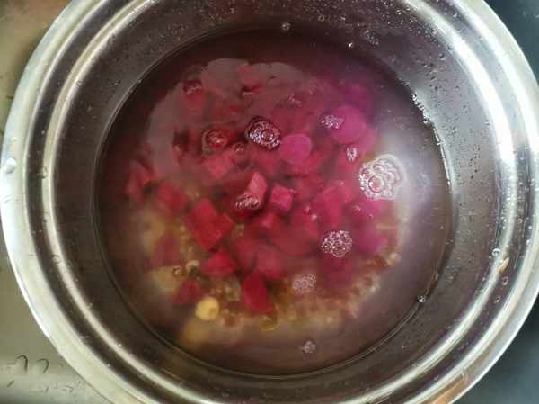 所用資料:紅小豆,糙米,大米,蕎麥仁,南瓜籽仁,百合,蓮子,紫薯2個。