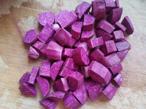 第二步:紫薯去皮,切成小丁。紫薯,是一種普通的食材,富含果膠、纖維素、胺基酸、維他命及多種礦物質,同時還富含硒元素和花青素。紫薯富含的硒和鐵是人體緩解疲勞、緩解衰老、補血的必要元素,硒易被人體吸收,可留在血清中,修補心肌,清除體內自由基。所以在紫薯上市的季節,更要多吃一些紫薯,有益身體健康。