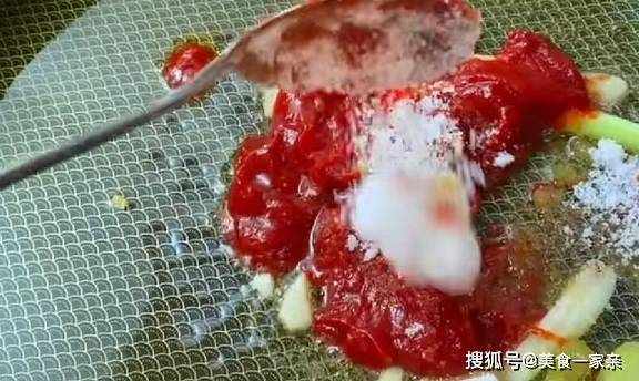第三步,鍋中留少許的油,然後加入蔥段,薑片,蒜片,以及花椒和香葉等料,炒香後,加入一大勺的番茄醬,番茄醬是做這道茄汁鮁魚的關鍵,最好都放進去。接著再加點白糖,翻拌勻乎。