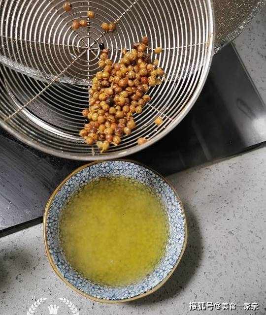 4.半把花椒加120克水煮開後熬制1分鐘。花椒棄之,花椒水留用。