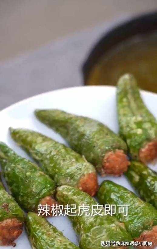 4.鍋中倒油,油溫7成熱時,下入辣椒釀,中火炸3分鐘,辣椒起虎皮即可撈出