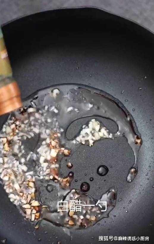 5.鍋中留油,下入蒜末,加入生抽一勺、白醋一勺、半碗清水燒開,勾芡濃稠後,澆在辣椒釀上即可