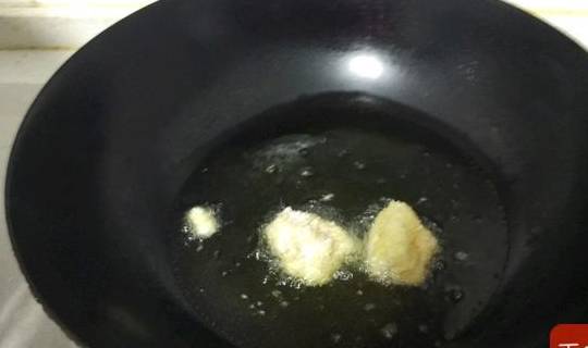7.鍋裡下油,把龍利魚放入鍋裡煎炸,炸到金黃色時撈出