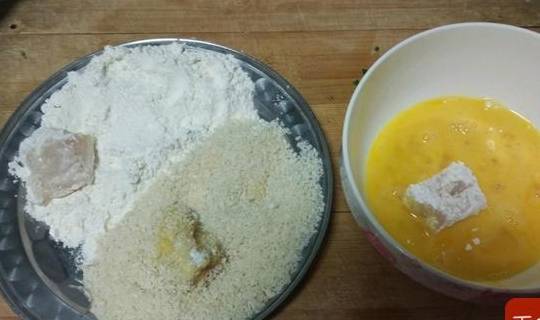 6.把醃制好的龍利魚在雞蛋液中滾一下然後在面粉中過一下,再在雞蛋液中過一下,再在面包糠中滾一下