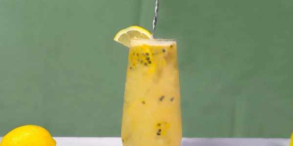 百香果汁30毫升、椰果50克、黃檸檬2片、冰水200毫升、乳酸菌20毫升、白砂糖25毫克、冰塊150克