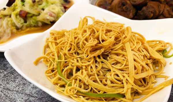 1、把豆皮切成細一點的絲,越細越好。尖椒去除辣椒籽,切成絲。