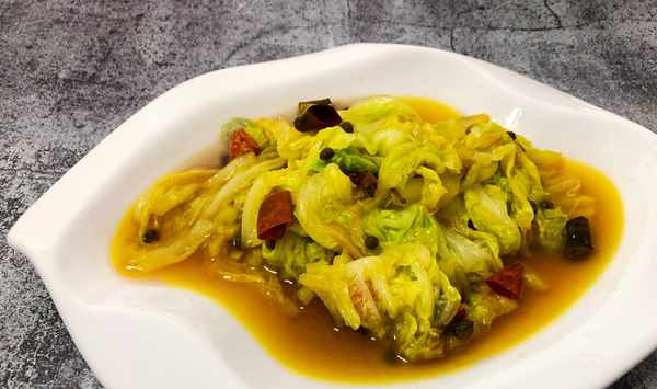 3、加入之前處理好的白菜,快速的翻炒,炒制白菜發軟,體積明顯縮小。