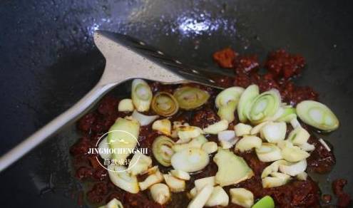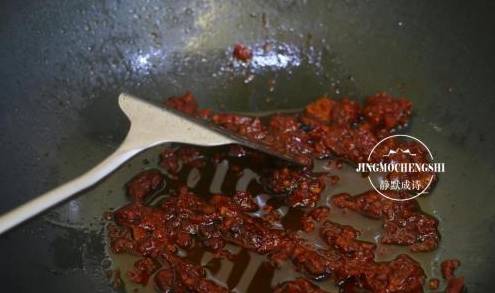 4、熱鍋熱油,下郫縣豆瓣醬小火炒出紅油。話說這個郫縣豆瓣醬可是萬能的調味料,做任何的香辣菜它都是主角。