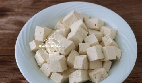 2、北豆腐切成小塊兒,先焯一下水,撈出,瀝水。北豆腐有豆腥味兒,焯水是為瞭去掉它的豆腥味兒,再一個,焯過水的豆腐也能更快地入味兒。