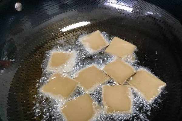 再把苦櫧豆腐片放進鍋中去煎,煎的時候不需要頻繁的翻動,因為這種豆腐很容易碎,所以一定要煎至底部定型之後再翻面,把兩面都煎成金黃色就可以先盛出來放一邊。
