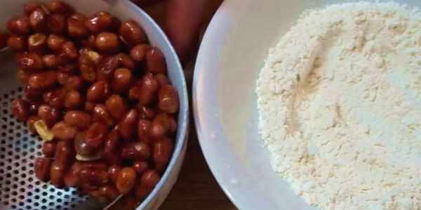 5,撈出花生米放入盆中,分次倒入面粉搖晃面盆,讓花生米滾成小圓球,最後篩掉多餘的面粉