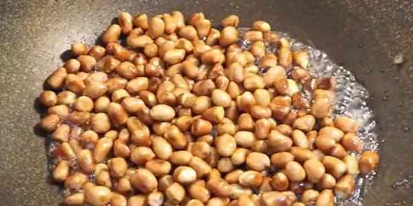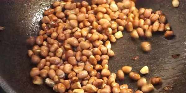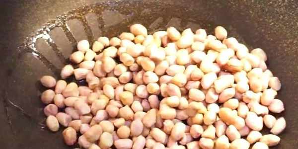 1,先炒花生米,鍋裡放少量油,倒入花生米小火煸炒