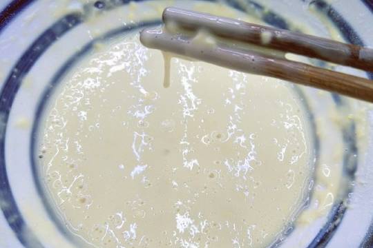 4.取一個大碗,放入面粉,淀粉比例為3:1,一個雞蛋,和少量純凈水,邊加邊攪拌,變成緩慢滴落狀態