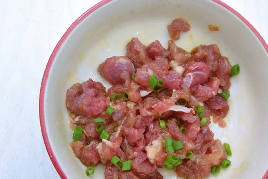 1.豬肉剁成泥,加入蔥粒,蒜泥,薑絲,蛋清,少許淀粉,料酒,蠔油,生抽,鹽抓勻醃制