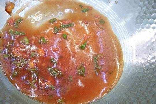 6.蔥薑蒜下鍋,紅椒黃膠切成粒,倒入番茄醬,少許醋,少許糖,一小碗水,攪拌後倒水淀粉水,勾芡