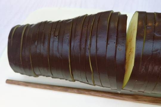 2.茄子下放根筷子,切片。整根切完後,拿掉筷子,隔兩片斷一刀