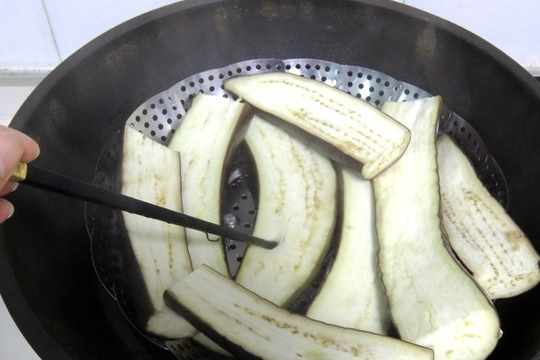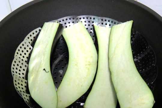 1.首先處理茄子,茄子洗淨一刨兩半,凉水入鍋,放在蒸屜上。,