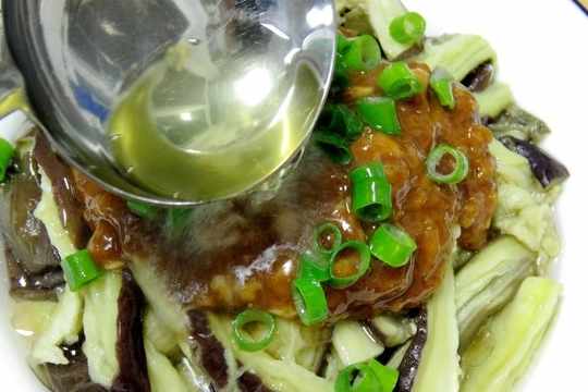 6.把料汁澆在茄子條上,茲拉一聲,澆上熱油即可上桌食用。