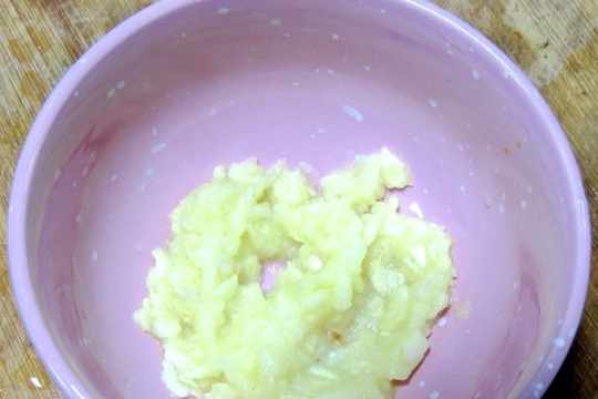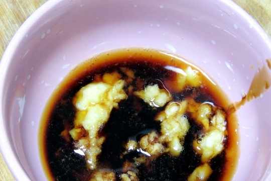 3.調製料汁,大蒜去皮放入蒜臼子中搗成蒜泥,放入碗中。