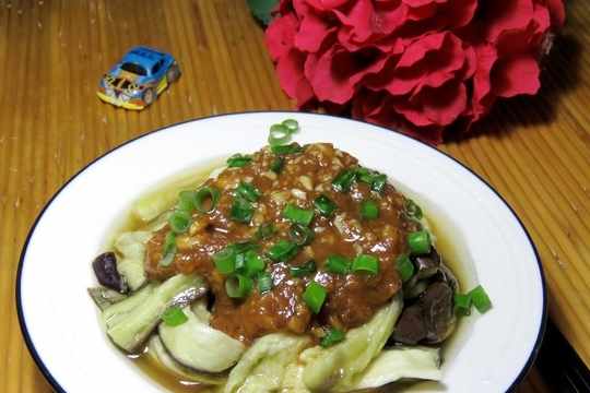 茄子250克、葱適量、蒜100克、花生油5克、生抽5克、醋5克、蚝油3克、花生醬25克