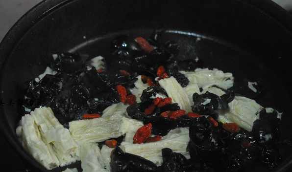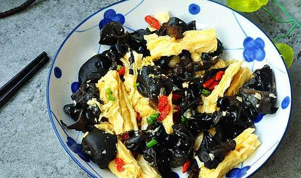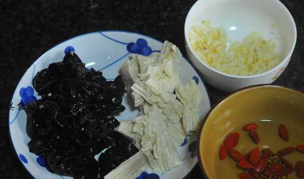 幹腐竹一根、黑木耳8朵、枸杞5克、胡椒粉撒了、蒜適量、花生油適量、精鹽適量