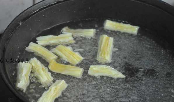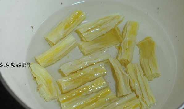 3.燒開一鍋水,將浸泡好的腐竹倒入鍋中汆燙一分鐘。
