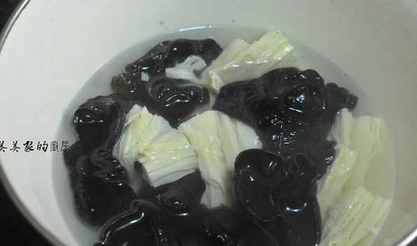 5.將燙好的黑木耳和腐竹倒入冷水中泡凉後撈出來控幹水備用。