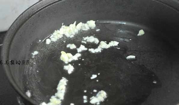 8.油鍋燒熱,倒入蒜末和花椒粉炒出香味。