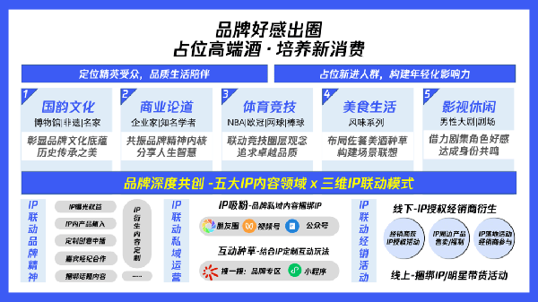 騰訊的全域生態中,積累瞭不同維度的多樣化優質內容資源,品牌可以從國韻文化、商業論道、體育競技等五大IP領域著手,通過與IP的三維深度聯動,實現對精英受眾、新進人群等白酒核心圈層的有效占位。