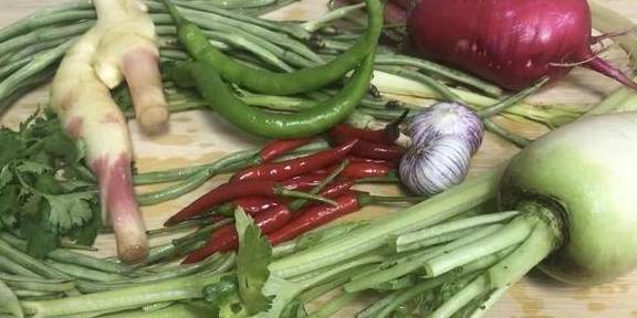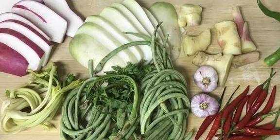 1:首先我們買些蔬菜,初次做泡菜時,一般選用紅皮蘿卜、白蘿卜、青辣椒,小米辣、香芹等,把這些蔬菜洗凈後,晾幹水分。改刀即可。