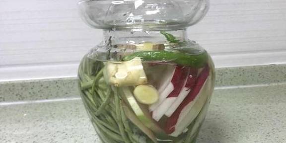 6開始依次的放蔬菜,豇豆、蘿卜、辣椒、香芹,大蒜、最後放上香料包,倒上高度不酒。倒上老鹽水。