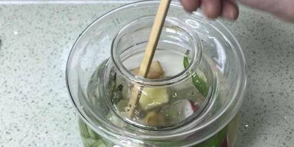 4往壇子裡面加涼白開或礦泉水或純凈水,加土冰糖、泡菜鹽(沒有泡菜鹽用無碘鹽),用幹凈無生水,無油的筷子攪拌,使其混合均勻。