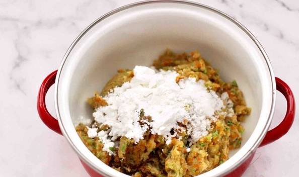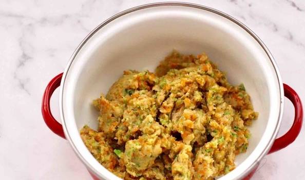 4.把攪打好的雞肉餡,放入一個大一點的容器裡。