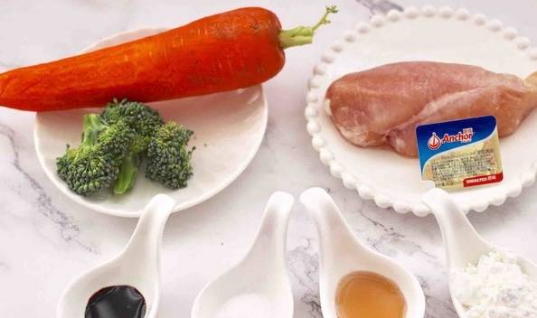 雞胸脯肉180克、黃油5克、胡蘿卜40克、西蘭花25克、玉米淀粉10克、精鹽5克、生抽5克、白糖6克、料酒5克、胡椒粉1克、雞精0.5克